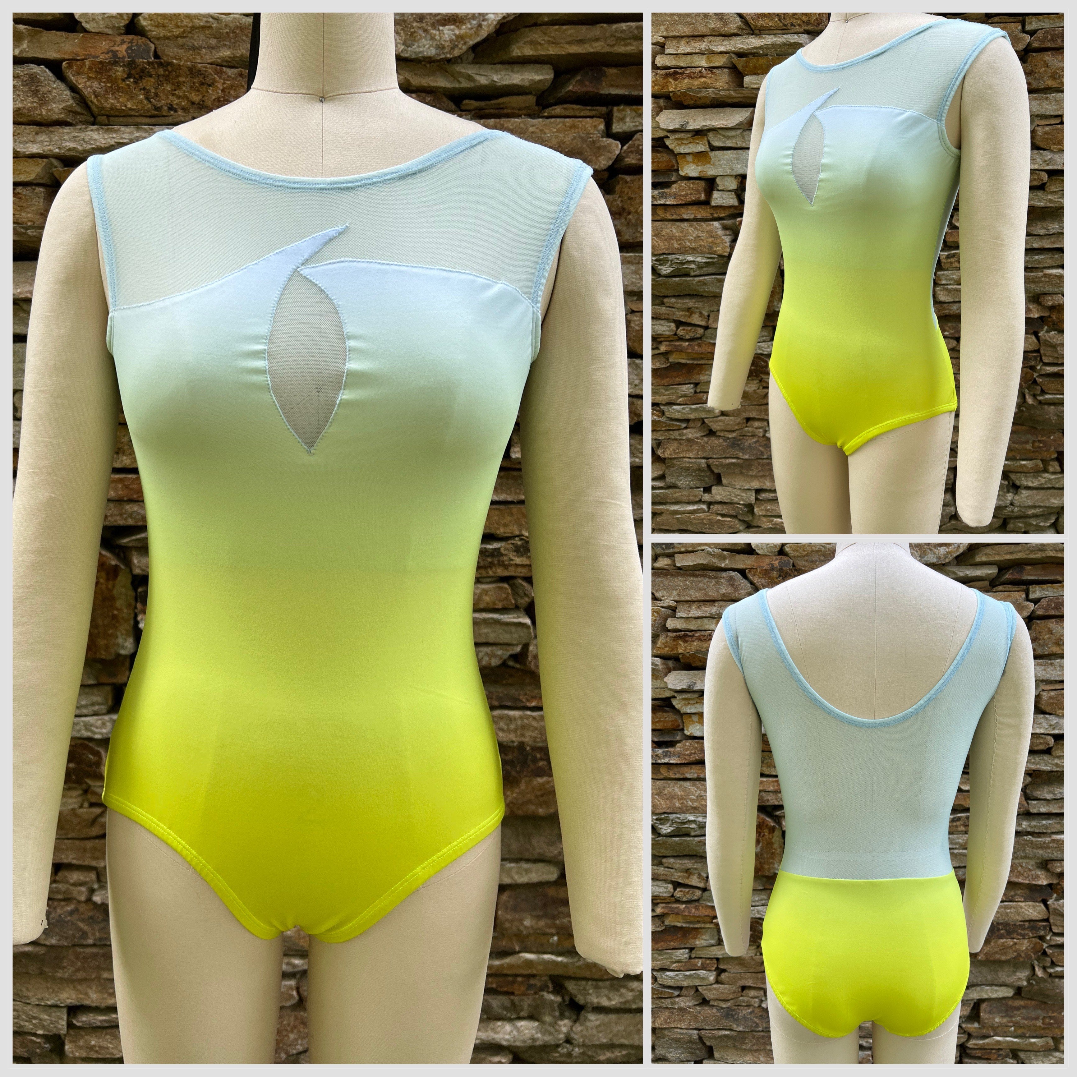 Are you ready to stand out? This ombre is perfect for that. Featuring a citron yellow fading into aqua blue up into the meshing. Fun neckline accents that help blend the solid fabric into mesh. Grab this leotard for 24 hours only!